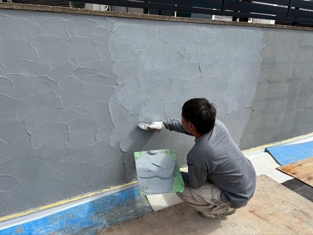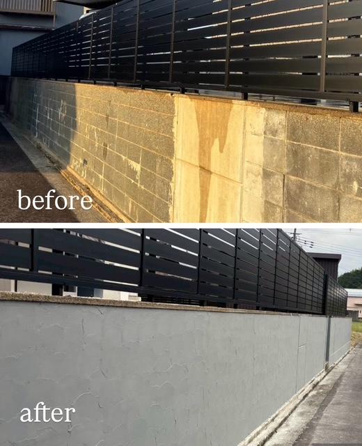 経年劣化と共に汚れたブロックもジョリパットを塗って綺麗になりました‼︎作業の様子 パターンをつけています。今回使用した色は右側のt5001というカラーです。 ジョリパットのカラーはとっーてもたくさんあります。 お店にサンプルを置いていますので気になる方は是非。リフォーム外構も承っております♪